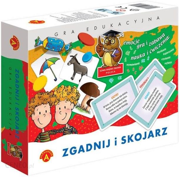 Sowa Mądra Głowa – Zgadnij i skojarzLogopedyczna gra edukacyjna. Jej uczestnicy słuchają uważnie czytanych kolejno ( z kart) rymowanych zagadek. Każdy z graczy, który odgadł odpowiedź stara się jak najszybciej odnaleźć właściwy dla niej obrazek leżący na stole. Gracz, który pierwszy położy swój żeton na odpowiednim obrazku musi głośno wymówić jego nazwę. Zwycięzcą w grze zostaje ten, kto wskaże i wymówi prawidłowo najwięcej trafnych odpowiedzi. Gra jest pełną emocji zabawką, w której dzieci ćwiczą artykulację spółgłosek szeregu syczącego s-z-c-dz; ciszącego ś-ź-ć-dź; szumiącego sz-ż-cz-dż. Dzięki grze dzieci nie tylko trenują i utrwalają wymawianie głosek, ale także doskonałą koncentracje, refleks, spostrzegawczość, pamięć i umiejętność czytania, świetnie się przy tym bawiąc.Zawartość opakowania55 kart zagadek, 55 tabliczek z obrazkami, 40 kolorowych żetonów, instrukcja.