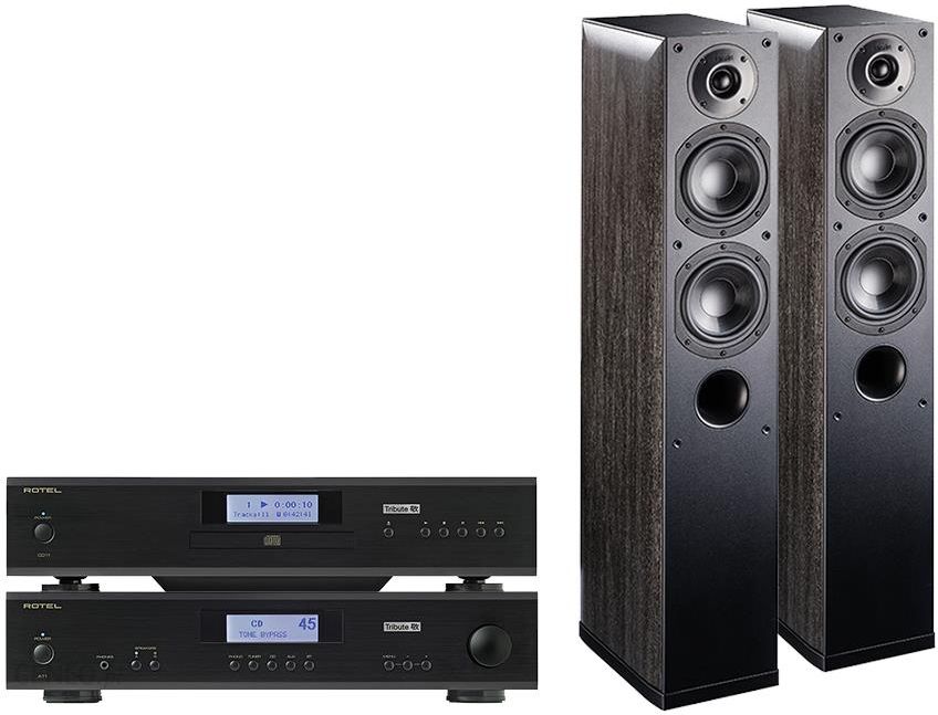 Zestaw stereo składający się ze wzmacniacza Rotel A11 Tribute, odtwarzacza CD11 Tribute oraz głośników Indiana Line Nota 550